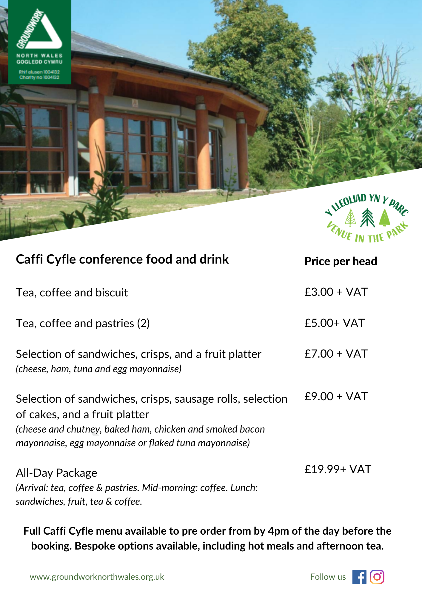 Supporting the community - Venue in the Park and Caffi Cyfle are managed by Groundwork North Wales. Our aim is to support the lives of individuals with all abilities by providing an in-house work and volunteering programme. By booking Venue in the Park you are supporting our charitable and social objectives which can be included in your company's corporate social responsibility and environmental, social and governance contribution.