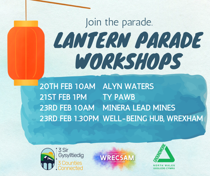 If you’d like to join in the preparation in the run up to the parade, people can join one of our local lantern workshops. These lantern workshops will take place at Ty Pawb on 21st February from 1pm – 3pm, Minera Lead Mines on 23rd February from 10am – 12pm, and Wrexham Well-Being Hub on 23rd February from 1.30pm – 3.30pm.