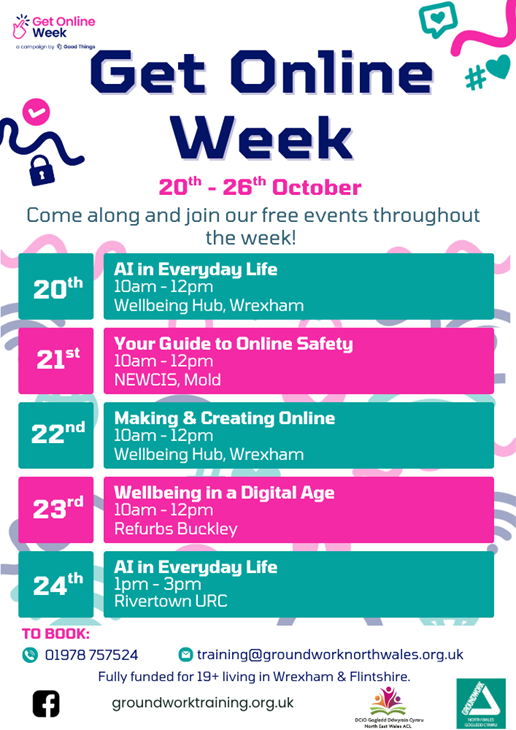 As part of Get Online Week, Groundwork Training will be offering free digital skills workshops and sessions for all experience levels. These community sessions will provide practical information and hands-on support across a range of digital topics - from AI to online safety. Ensuring everyone gets online, builds confidence, and feel empowered in the digital world.