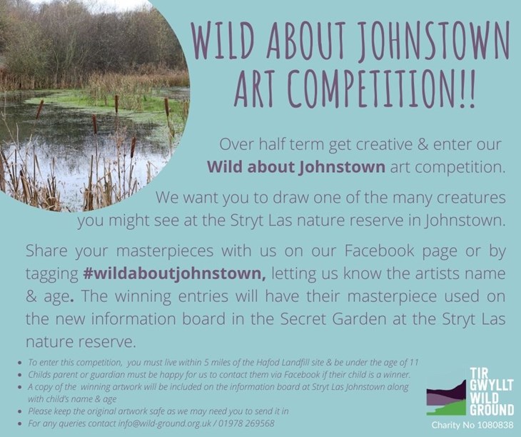 Share your masterpieces with us on our Facebook page or by tagging #wildaboutjohnstown, letting us know the artists name & age. The winning entries will have their masterpiece used on the new information board in the Secret Garden at the Stryt Las nature reserve.
